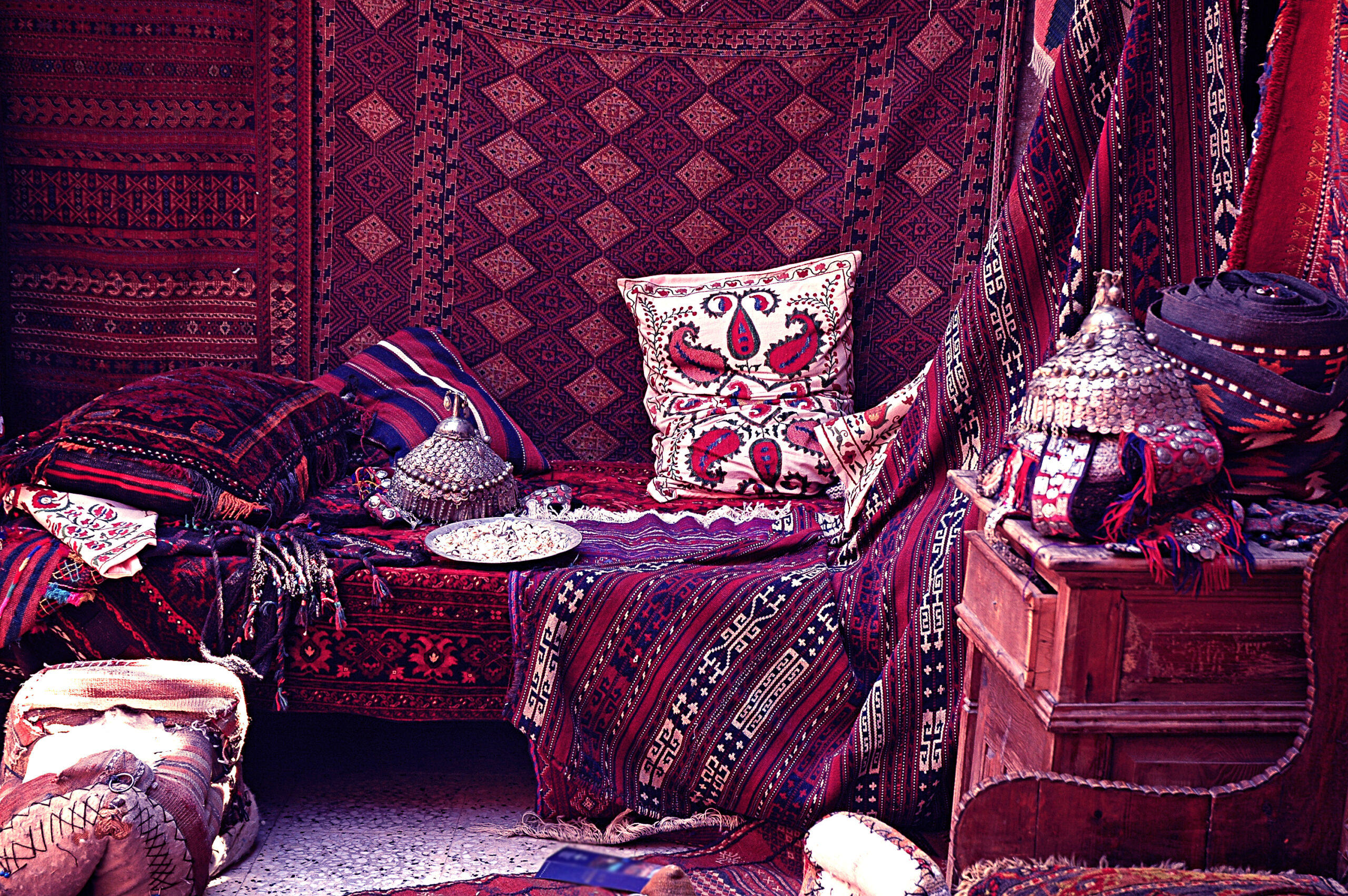 La palette è ampia e audace. Si usano spesso colori caldi e terrosi — come ocra, terracotta, arancione bruciato e verde oliva — abbinati a tonalità più vivaci come turchese, viola intenso, blu zaffiro e rosso rubino. L