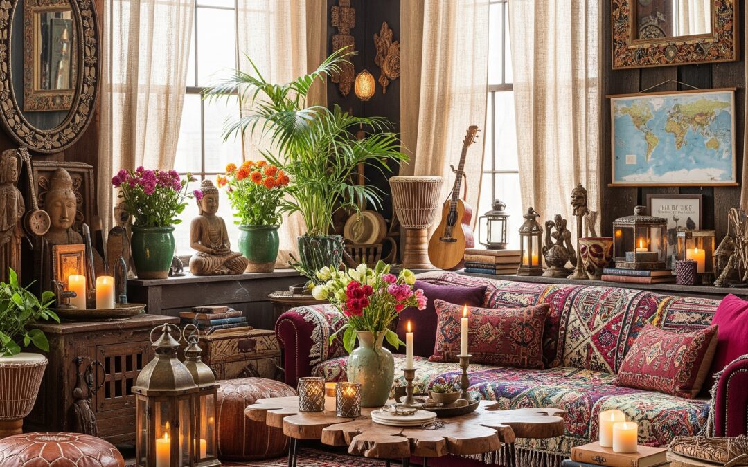 L’arredamento è un mix libero di pezzi vintage, mobili etnici, oggetti recuperati da mercatini o viaggi, e complementi contemporanei. Divani e poltrone comodi e avvolgenti sono un must, spesso arricchiti da cuscini e coperte. L’imperfezione è vista come parte del fascino.